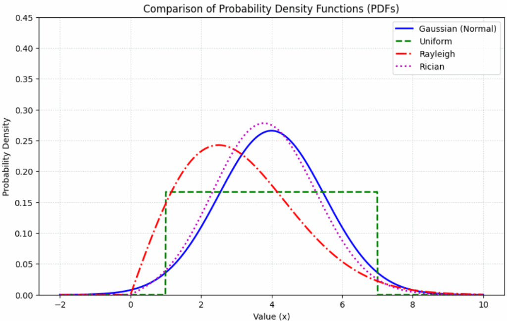 | Rayleigh | Fading in Non-Line-of-Sight (NLOS) wireless channels. | $\sigma$ (Scale parameter) |